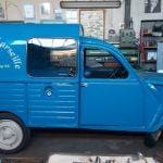 Citroen 2 CV Van version, first registration 1976 with French documents and French registration plate. This iss one of the later versions produced with front external lights, twin cylinders 435 cc engine. Totally professional restoration to all sheet metal, bottom, fenders and side panels, interior, shock absorbers and electrics, plus full engine replacement with newly constructed 600 cc .