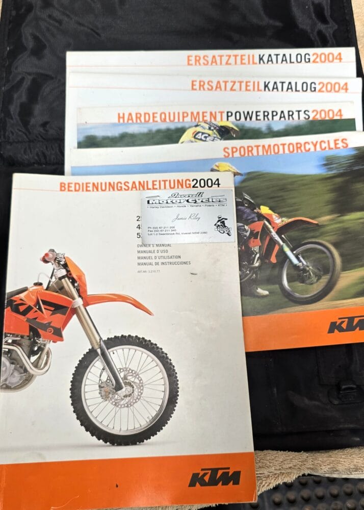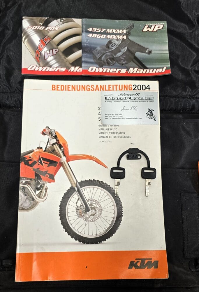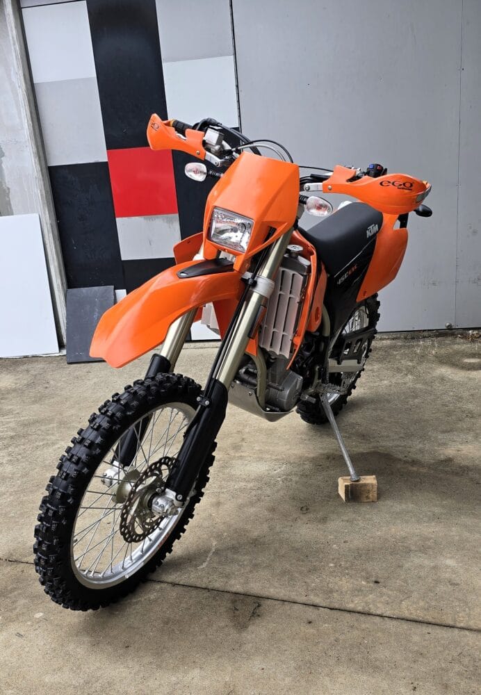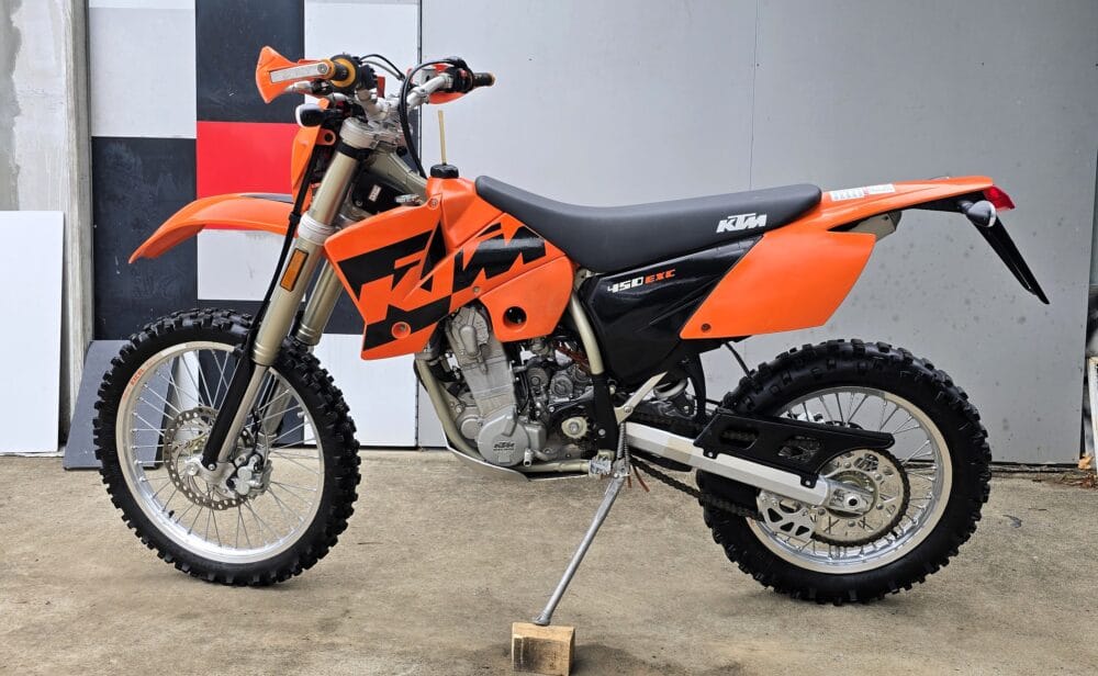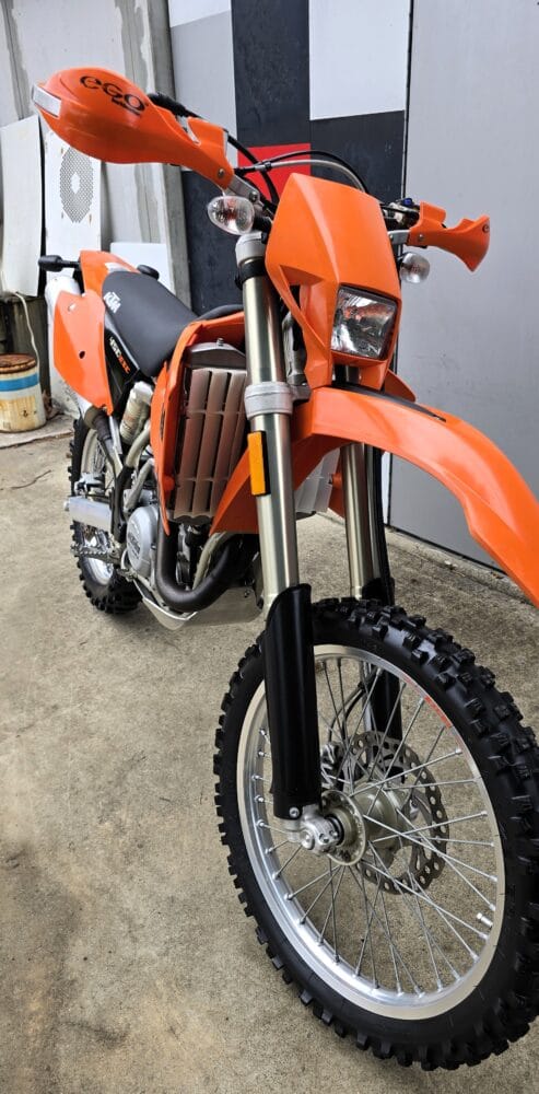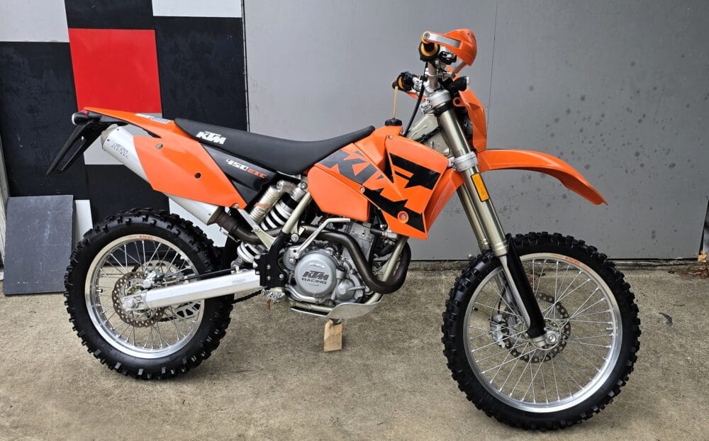 Commencing in 1993, KTM’s EXC line has become one of the longest-running and most respected enduro platforms in the world. By 2004, the EXC had benefited from significant refinements over previous models. The renowned RFS (Racing Four Stroke) engine received improvements that enhanced bottom-end torque and long-term reliability, while chassis updates, reduced weight, and upgraded WP suspension contributed to sharper handling and a more controlled, confidence-inspiring ride.
