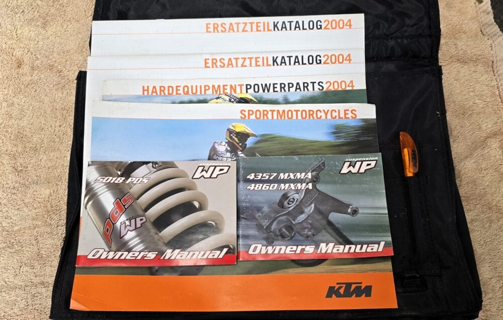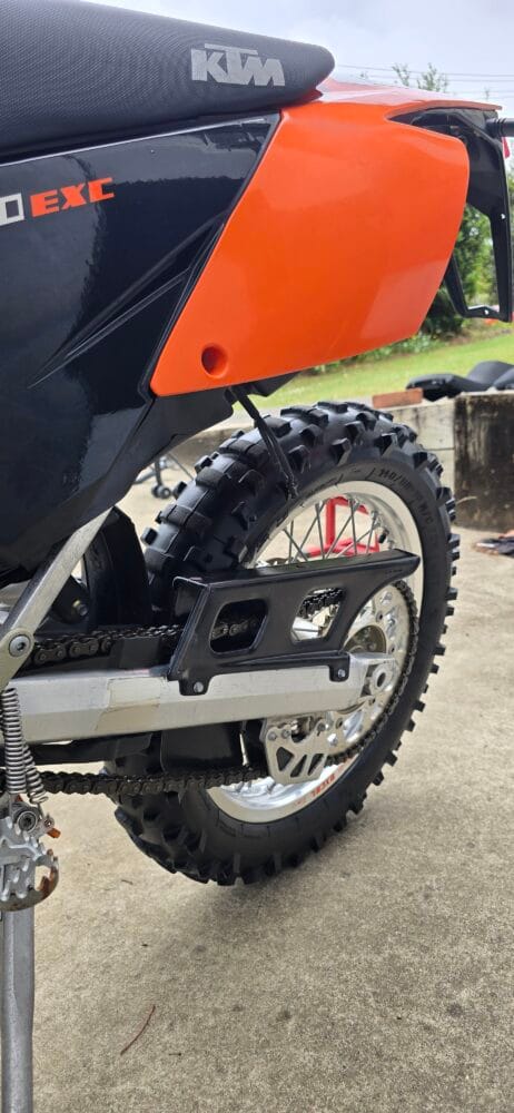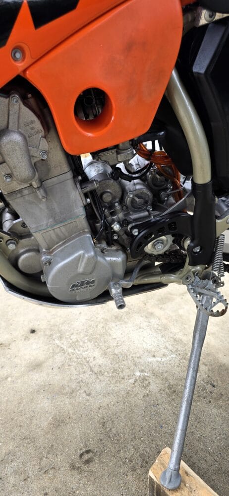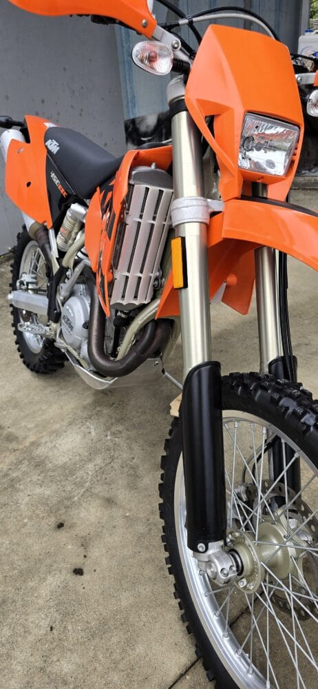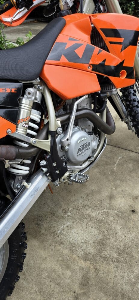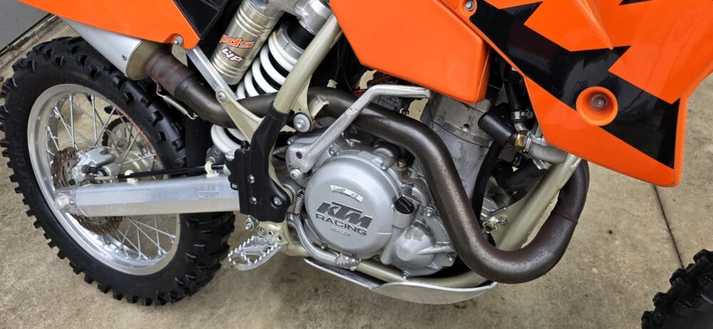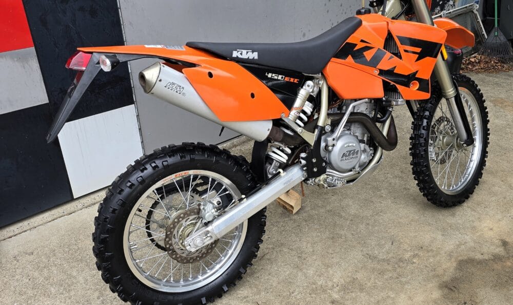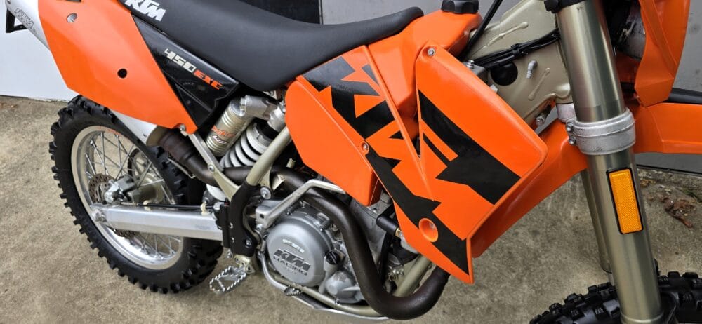 Commencing in 1993, KTM’s EXC line has become one of the longest-running and most respected enduro platforms in the world. By 2004, the EXC had benefited from significant refinements over previous models. The renowned RFS (Racing Four Stroke) engine received improvements that enhanced bottom-end torque and long-term reliability, while chassis updates, reduced weight, and upgraded WP suspension contributed to sharper handling and a more controlled, confidence-inspiring ride.