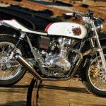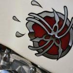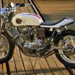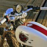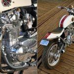 While an XS650, the engine has been bored to 750cc, the forks are from a Buell M2 Cyclone, and the Swingarm is a mid-’80 Yamaha Radian roadster. Helping to give the bike its unique hybrid style is an aluminum Storz café-style “bread loaf” fuel tank, originally intended for a Harley Sportster, the tank needed its tunnel heavily reworked to mate with the XS frame. Because the owner wasn’t enamored with the usual kicked-up flat-track tail, Pollock grafted a rear frame loop from a Wood-Rotax with its minimalistic, tightly drawn bodywork. Both tank and tail looking like they were destined to be together, are finished in a simple paint scheme, a pearl-white and maroon take on the old Yamaha racing colors. The artwork on the gas tank is the company’s classic tuning fork logo as envisaged by Salvador Dali. A fabulous-looking bike and far less than a third of the replacement value.